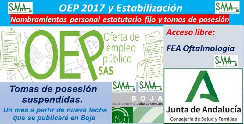 Publicadas en el Boja los nombramientos como personal estatutario fijo en la OEP 2017-Estabilización de FEA de Oftalmología, acceso libre. Tomas de posesión a partir de nueva fecha que se publicará en BOJA cuando la Administración lo decida. Instruccione
