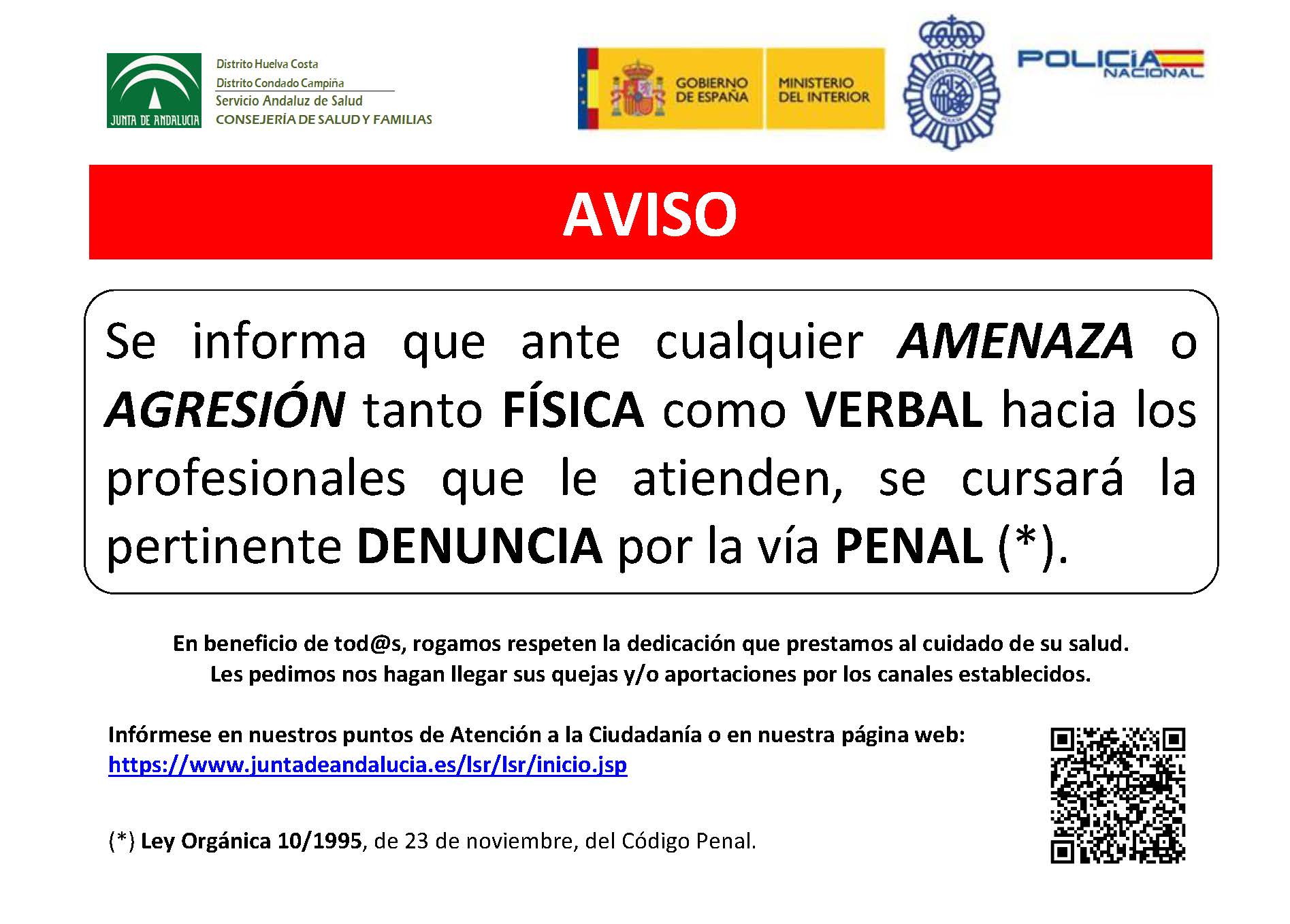 El Servicio Andaluz de Salud (SAS) ha lanzado una campaña informativa en los centros sanitarios para recordar a los usuarios que se denunciará por la vía penal cualquier agresión a los profesionales de dichos centros. Desde hoy comenzará a distribuirse cartelería tanto en los centros de salud como en hospitales donde se insiste a los usuarios en que “ante cualquier amenaza, coacción o agresión física y/o verbal o cualquier otra actuación ilícita contra los profesionales se cursará la pertinente denuncia por la vía penal, pudiéndose castigar estas acciones con penas de cárcel”.