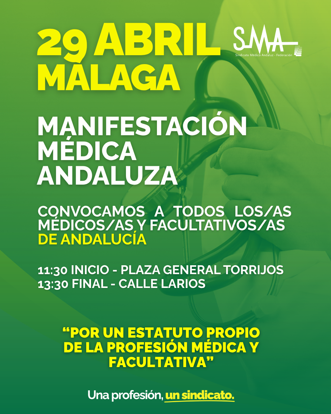 Animamos a todo el colectivo médico y facultativo de Andalucía a participar en la manifestación médica andaluza convocada para el próximo miércoles 29 de abril en Málaga para visibilizar nuestra unidad y determinación por conseguir unos derechos laborales justos y legítimos.