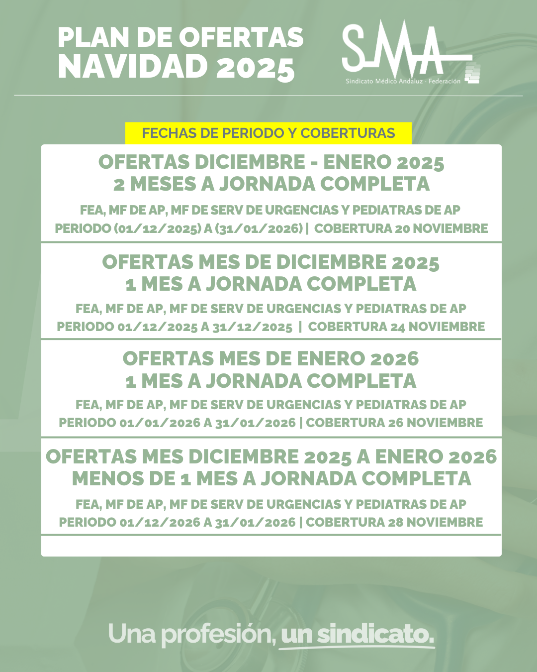 Las primeras ofertas para FEA, Médicos de Familia de Urg y AP y Pediatras de AP se realizarán a través de la Bolsa Única de Empleo del SAS que comienza el 20 de noviembre con la oferta de diciembre 2025 a enero 2026 a jornada completa.